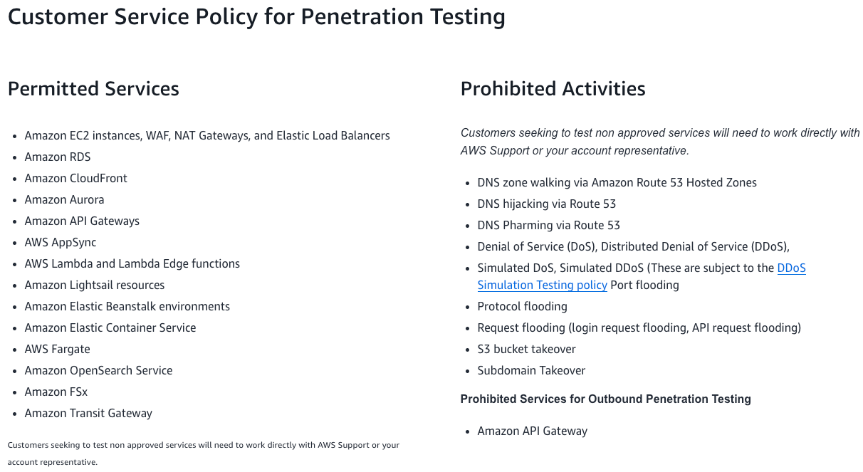 AWS Penetration Testing에서는 AWS 침투 및 보안 테스트 환경을 구성 가능합니다. 기본적으로 허용되는 서비스와 금지되는 활동은 아래 이미지와 같습니다.